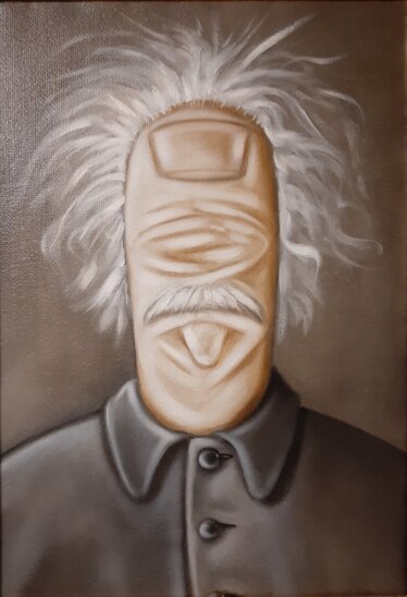 Sulla tela, il volto di Einstein prende forma con una vivacità sorprendente. Ogni pennellata, realizzata con la punta del dito, sembra sussurrare un'equazione, un concetto rivoluzionario nato dalla mente del genio. Gli occhi, rivolti verso un universo infinito, riflettono la profondità della sua visione e la sua incessante ricerca della verità.